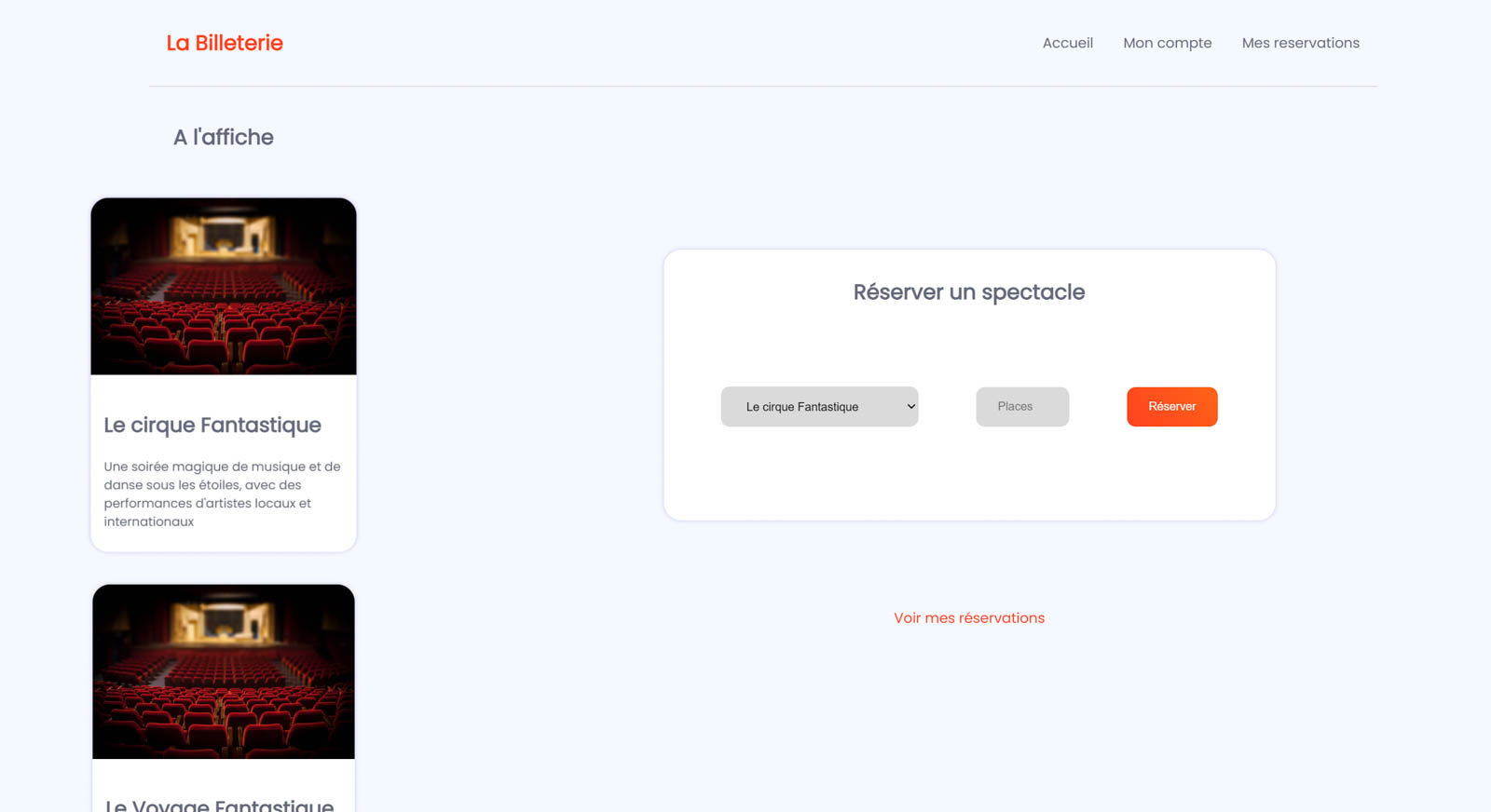 Dans le cadre de mon BUT MMI, j’ai conçu une application web de billetterie en ligne permettant aux utilisateurs de créer un compte, de se connecter et de réserver des places pour différents événements. L’interface a été pensée pour offrir une navigation simple et agréable.